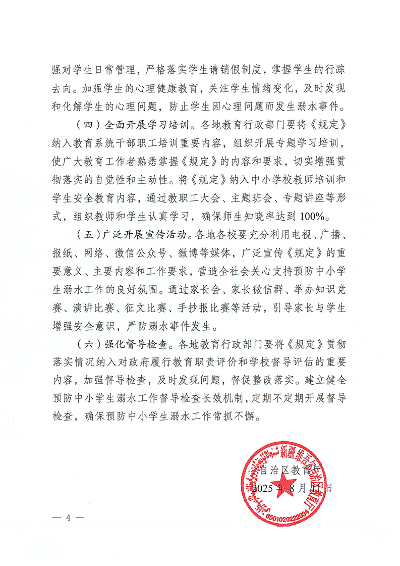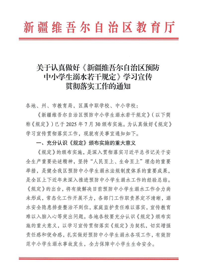 标题:关于认真做好《新疆维吾尔自治区预防中小学生溺水若干规定》学习宣传贯彻落实工作的通知
