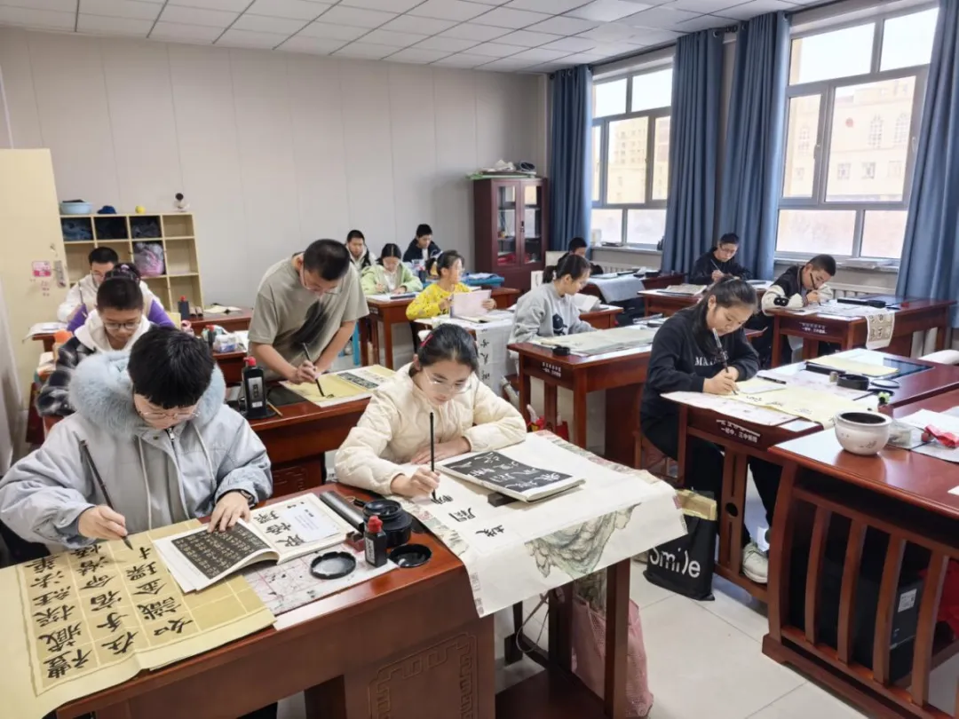 打造品牌化赛事矩阵,营造全民参与的书法文化氛围。以品牌赛事为引领,构建起“校园赛事+社会活动+成果展示”的多元传播体系。连续举办四届“兵地聚文杯师生临帖大赛”成为兵地融合的重要纽带;举办自治州第一届美育艺术节书画比赛,常态化开展“翰墨润疆”书法大赛、经典诗词书写等活动,累计收集学生书法作品8000余幅。依托文化馆、书画院面向全州学校文化骨干、书法教师举办“灵秀博州・文化润心”书法培训班,43名参训教师成为校园书法教育的“种子力量”,带动各校师生爱上书法、练习书法,形成“人人爱书法、人人练书法”的浓厚氛围。