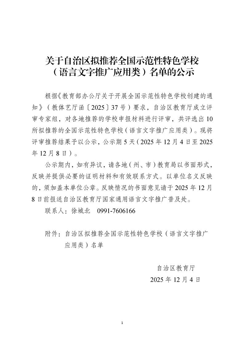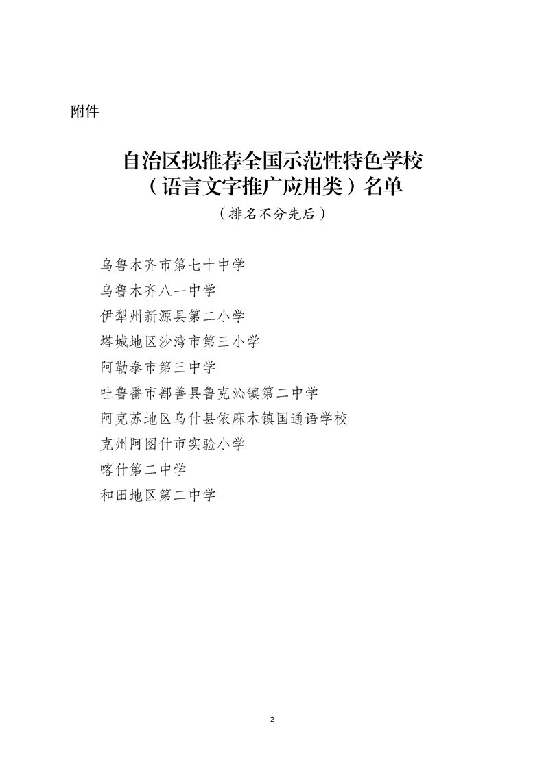 关于自治区拟推荐全国示范性特色学校(语言文字推广应用类)名单的公示