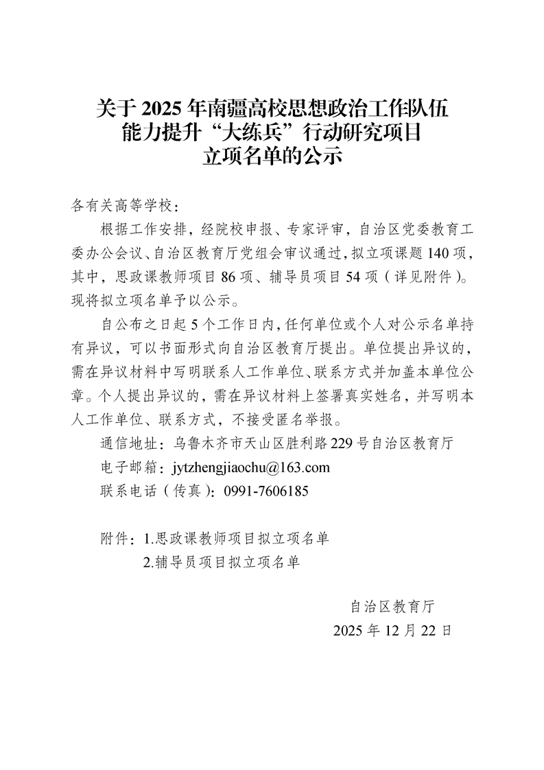 关于2025年南疆高校思想政治工作队伍能力提升“大练兵”行动研究项目立项名单的公示