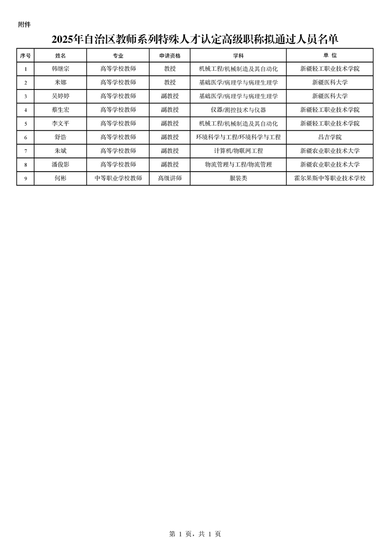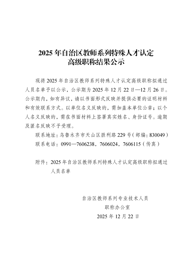 2025年自治区教师系列特殊人才认定高级职称结果公示