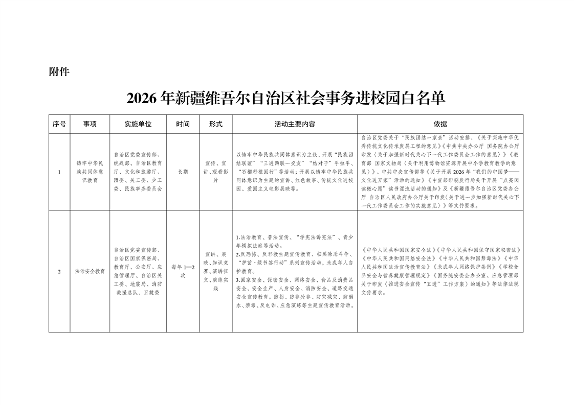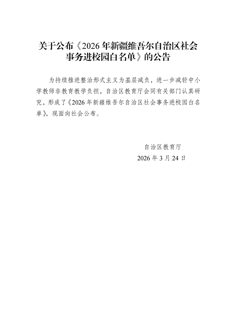 关于公布《2026年新疆维吾尔自治区社会事务进校园白名单》的公告