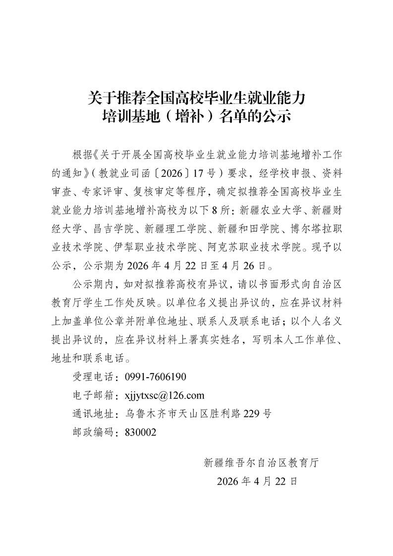 关于推荐全国高校毕业生就业能力培训基地(增补)名单的公示
