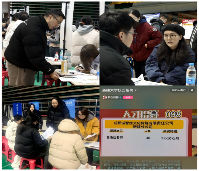 招聘会现场特别设置了就业服务专区和直播带岗专区,为毕业生提供全方位就业支持。天山区人力资源和社会保障局的相关负责同志现场开展“简历诊断”“政策咨询”等服务,累计服务学生330余人次,帮助毕业生提升求职竞争力。与此同时,新疆公共就业服务中心的工作人员在抖音、小红书、新疆365人才网等平台同步开展直播带岗活动,各平台累计观看15669人次,点赞24451次,有效扩大了活动覆盖面和影响力。