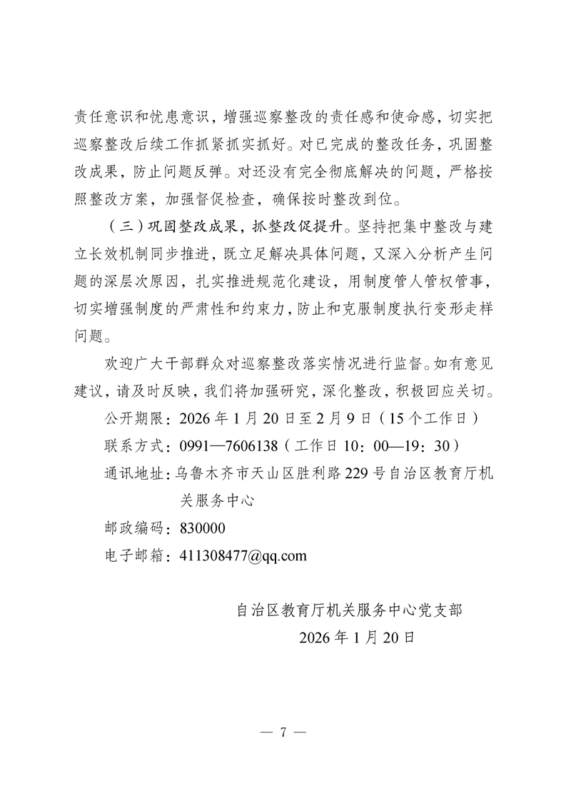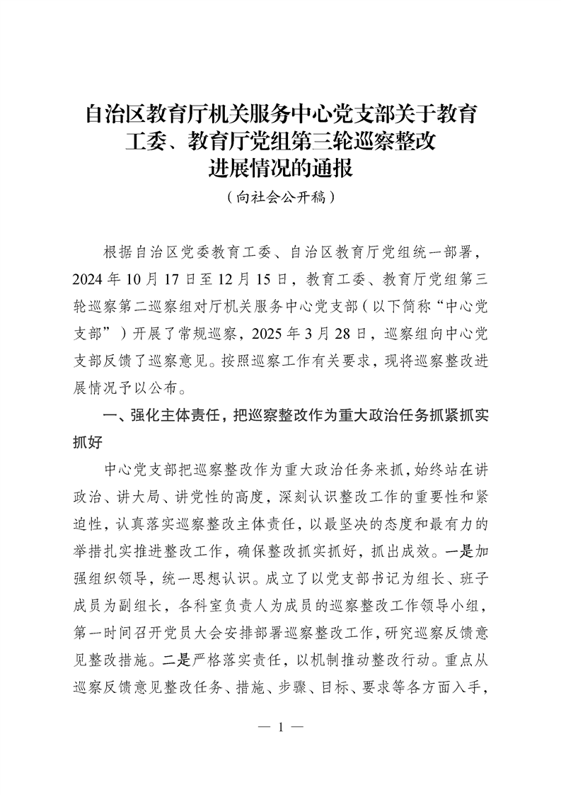 标题:自治区教育厅机关服务中心党支部关于教育工委、教育厅党组第三轮巡察整改进展情况的通报