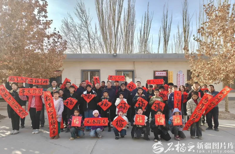 2月5日,新疆艺术学院书法专业师生在岳普湖县阿其克乡努开勒村驻村工作队与群众合影留念。霍泠屹摄
