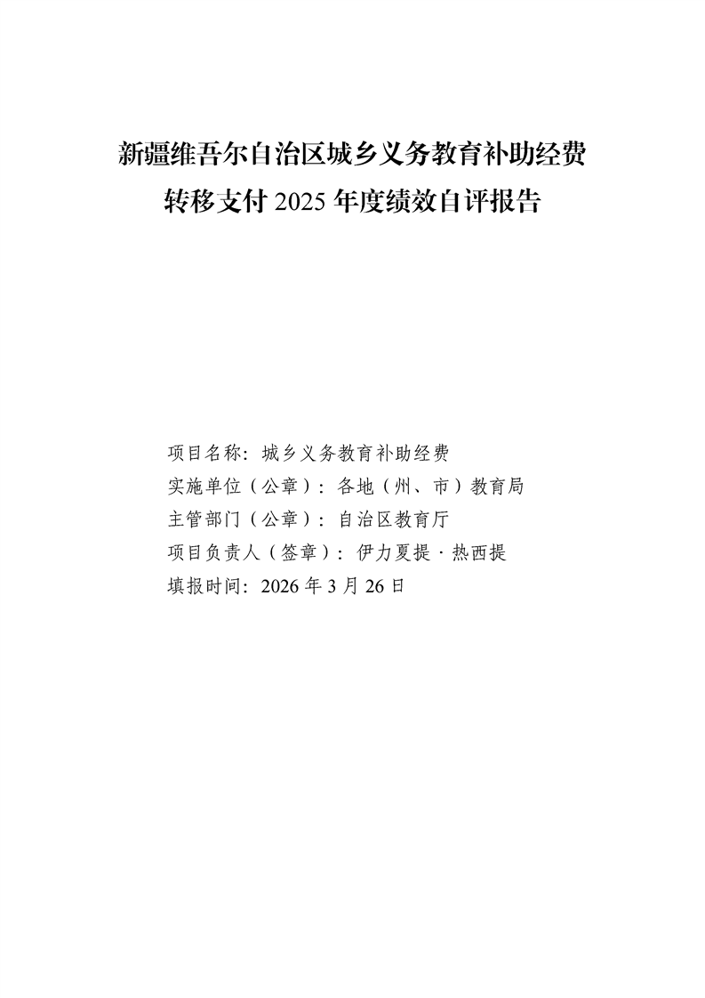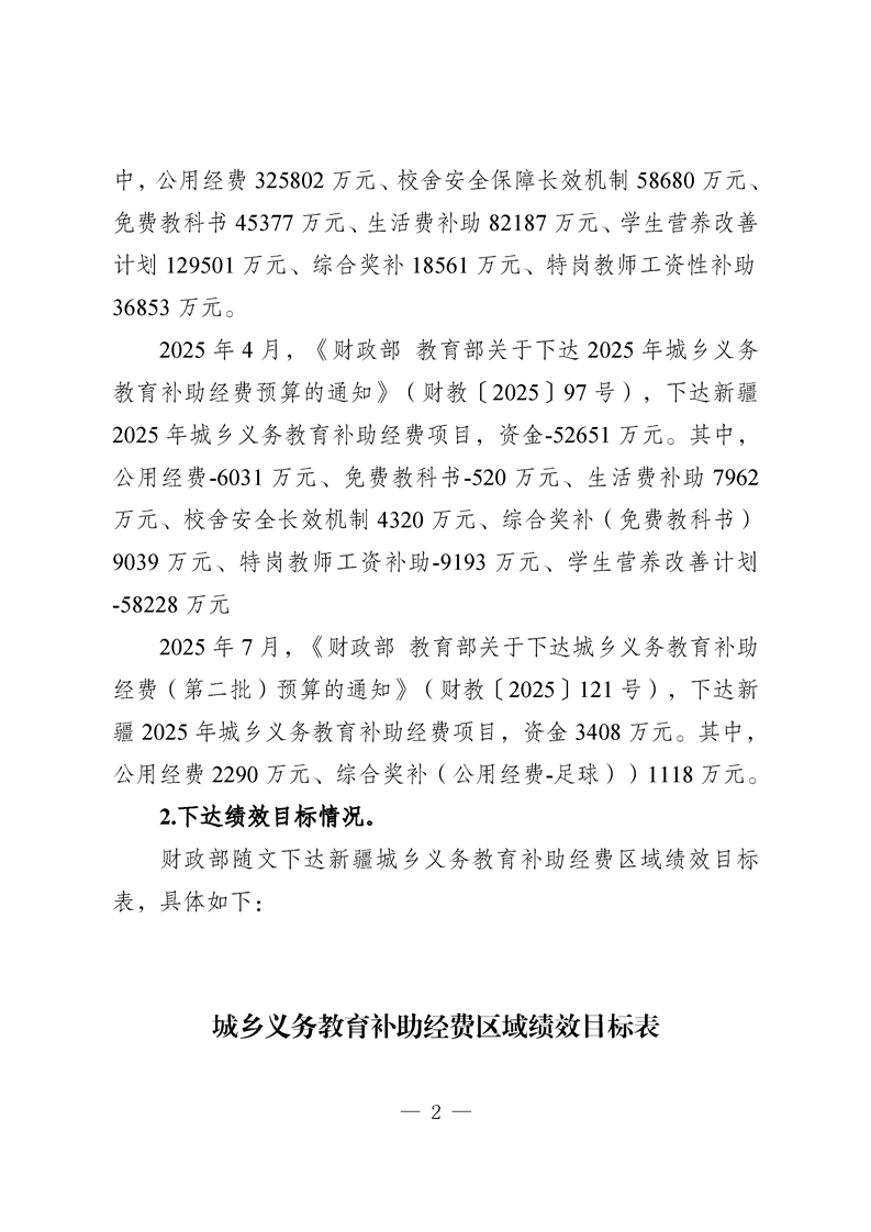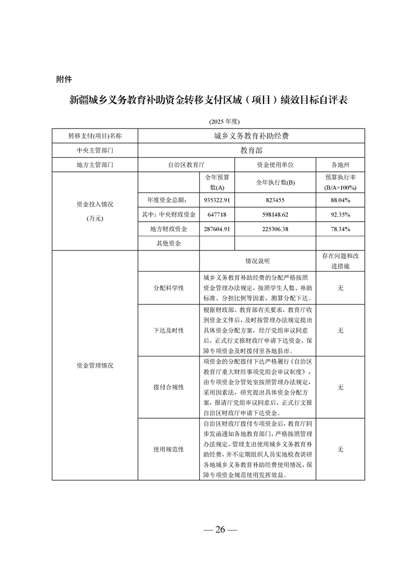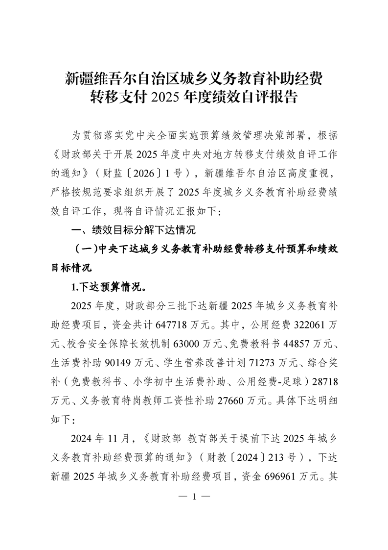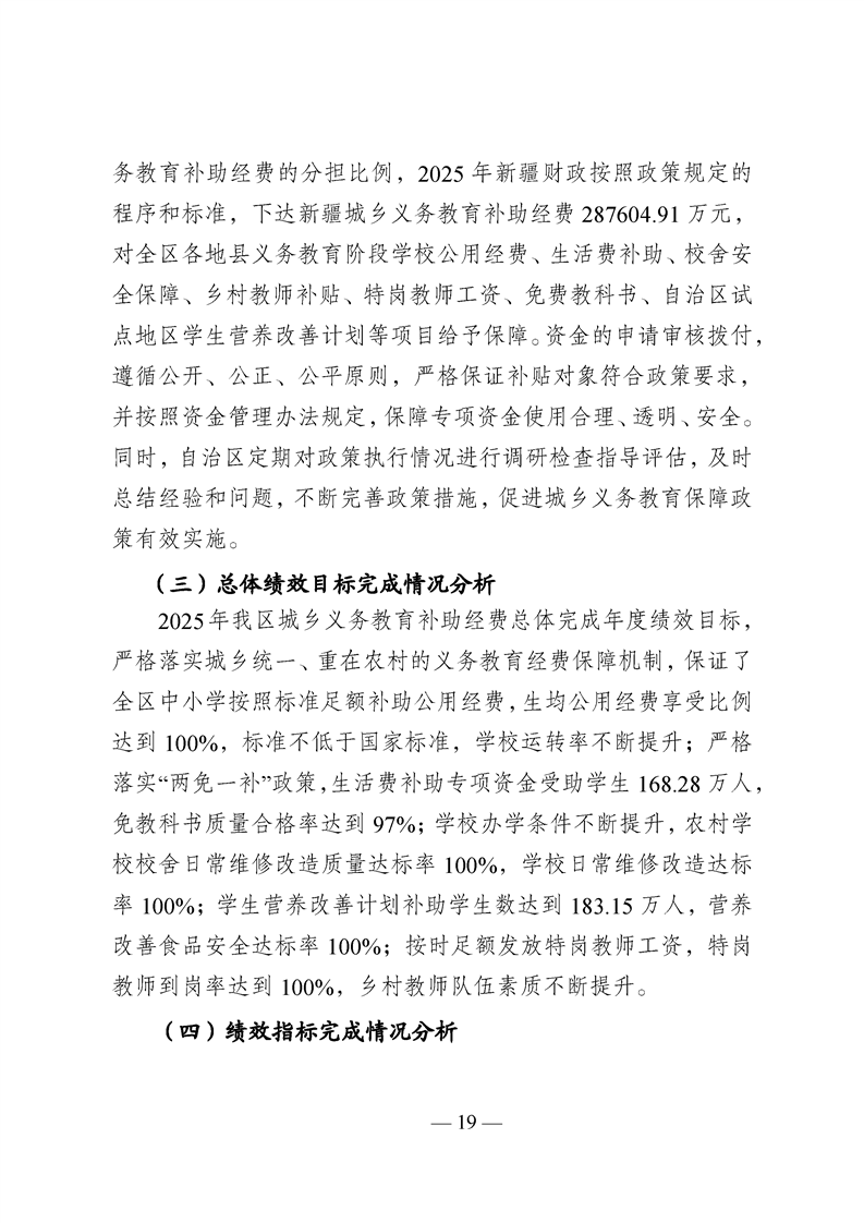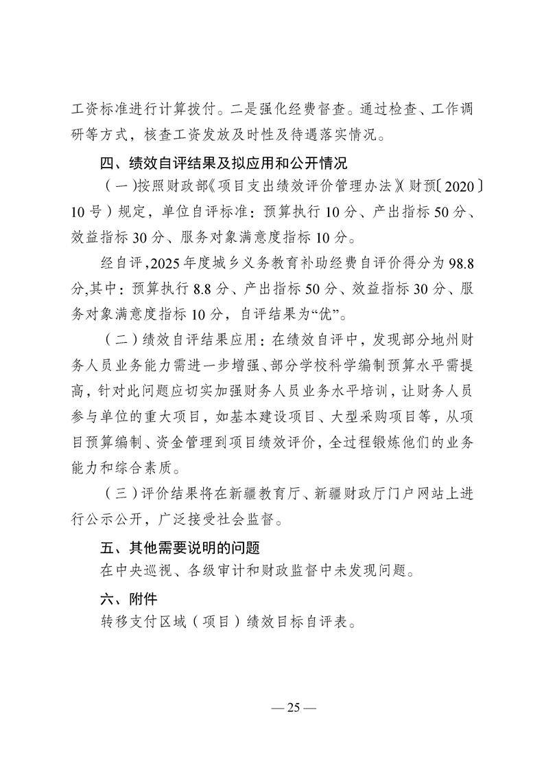 新疆维吾尔自治区城乡义务教育补助经费转移支付 2025 年度绩效自评报告