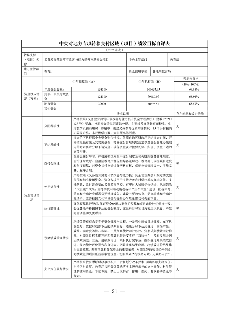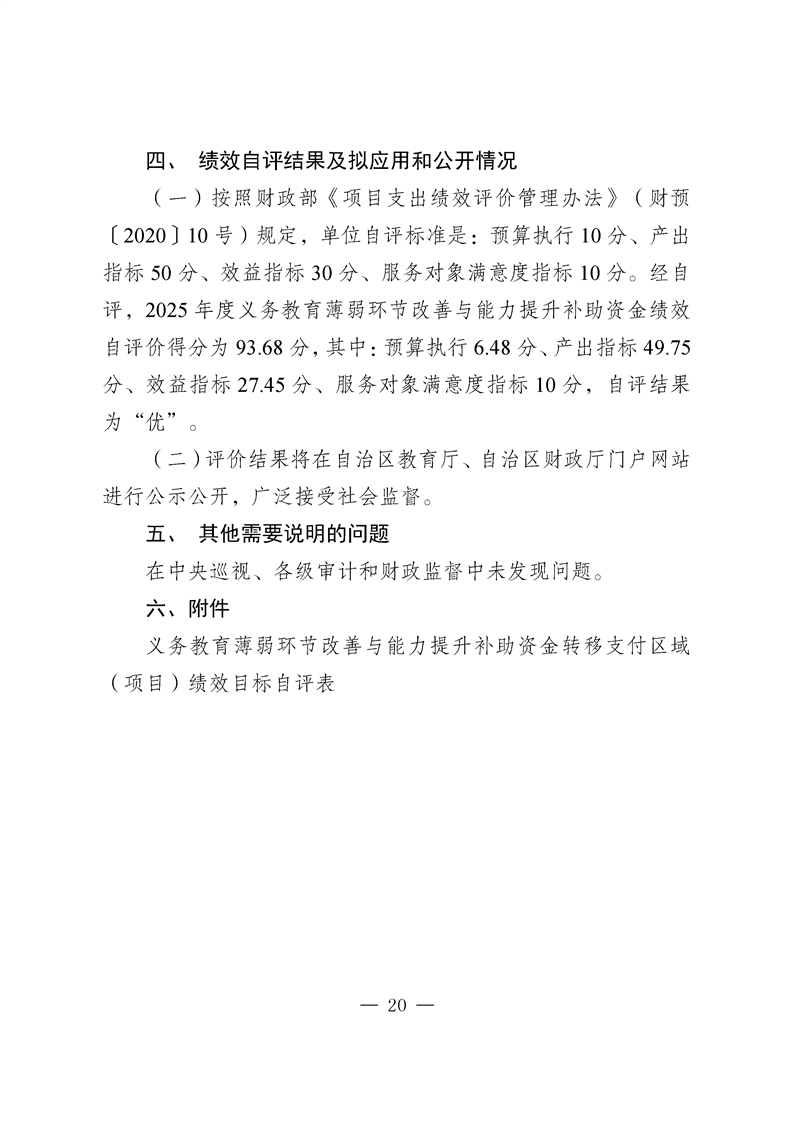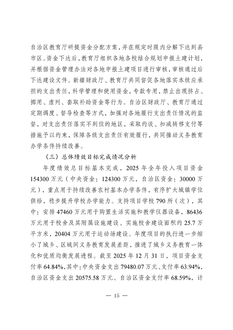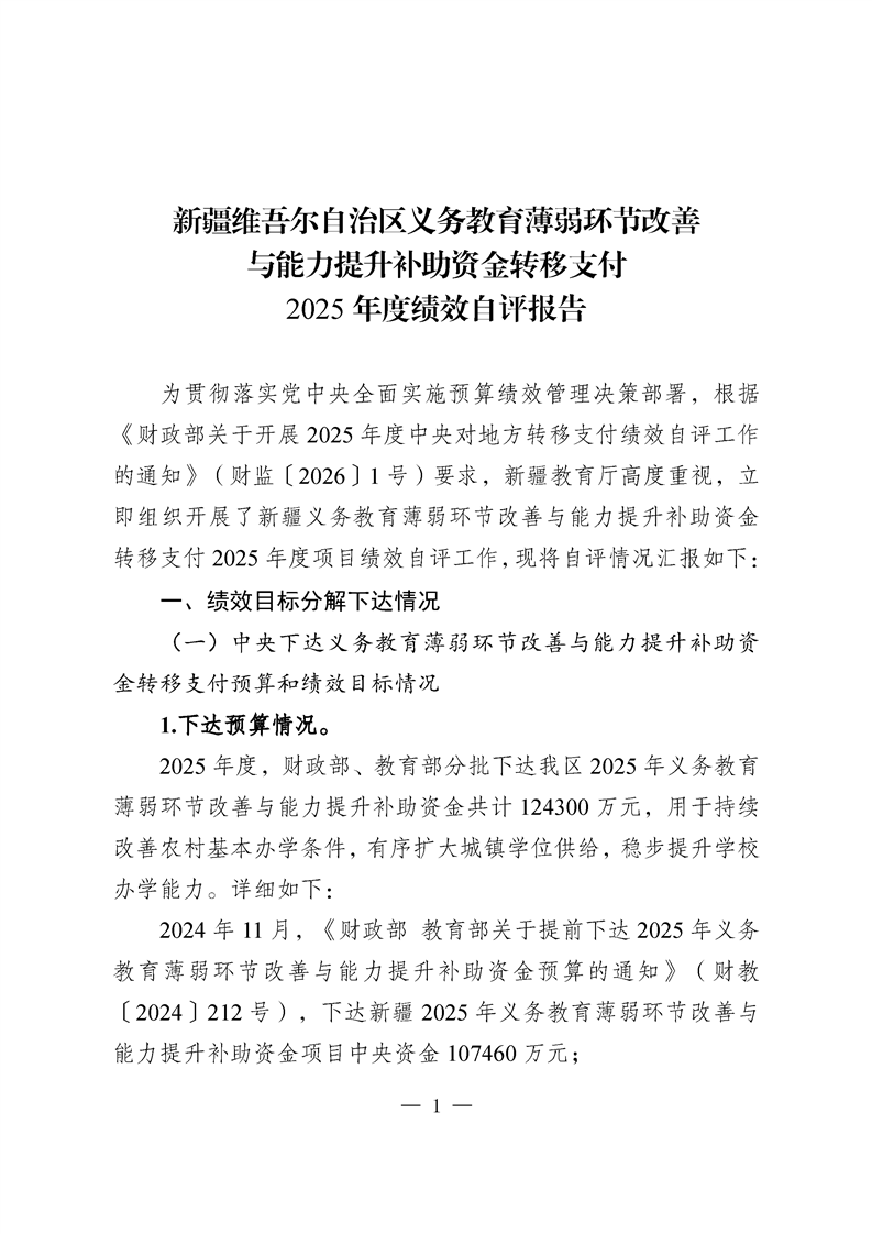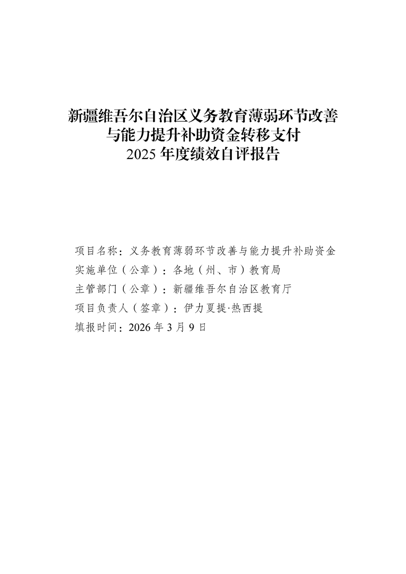 新疆维吾尔自治区义务教育薄弱环节改善与能力提升补助资金转移支付2025 年度绩效自评报告