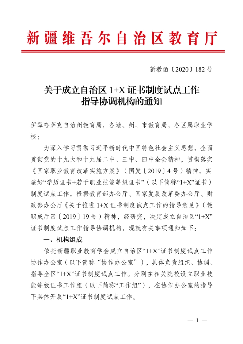标题:关于成立自治区1+X证书制度试点工作指导协调机构的通知