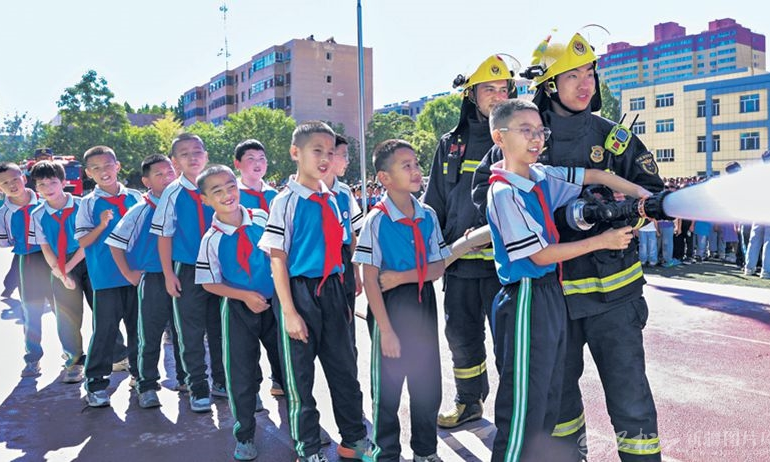 8月26日,库车市消防救援大队消防员走进库车市第四小学,开展开学第一课“消防安全进校园”主题活动。图为消防员指导学生进行消防演练。王雪妮摄