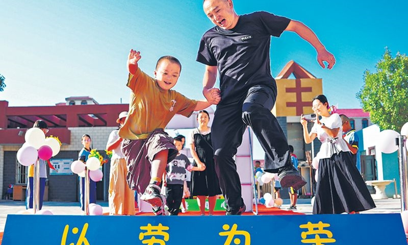 8月23日,吐鲁番市第六小学举行一年级新生入学仪式。图为新生在家长陪同下跨过“以劳为荣”门。谢懂飞摄